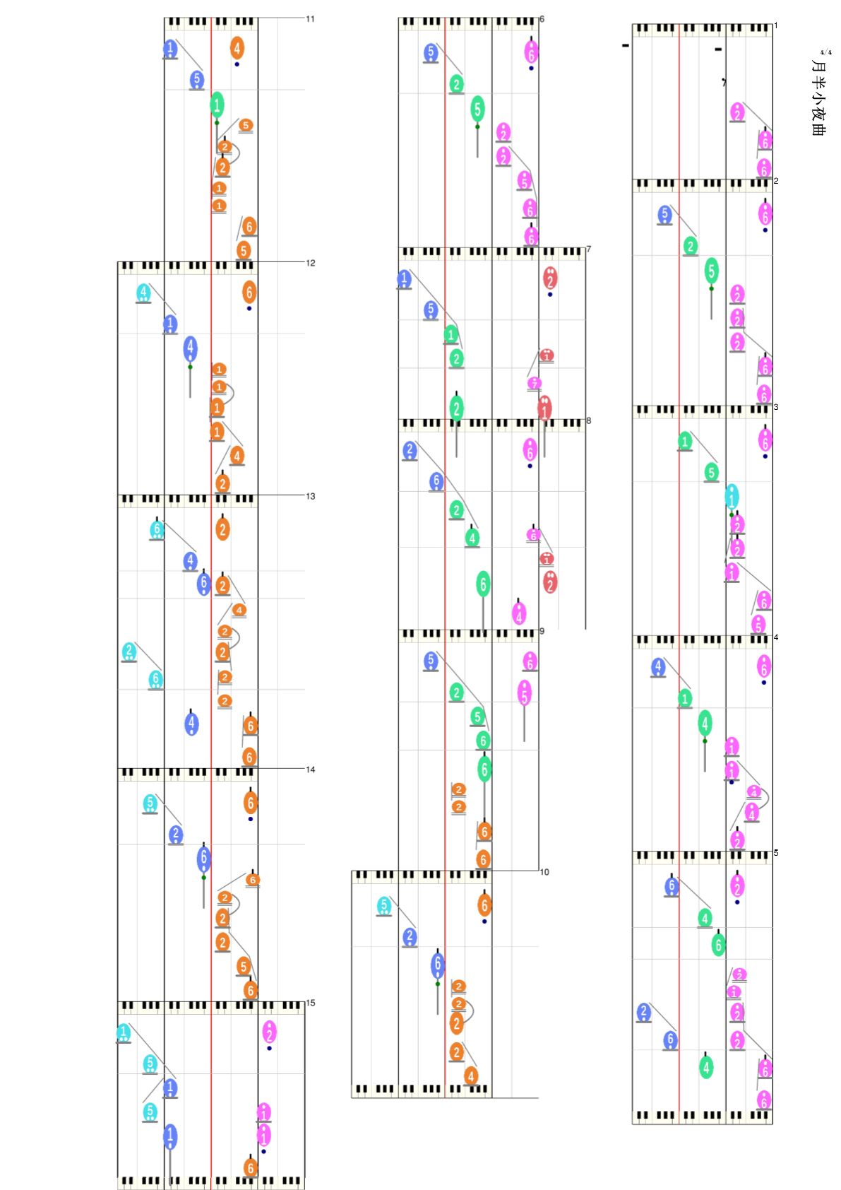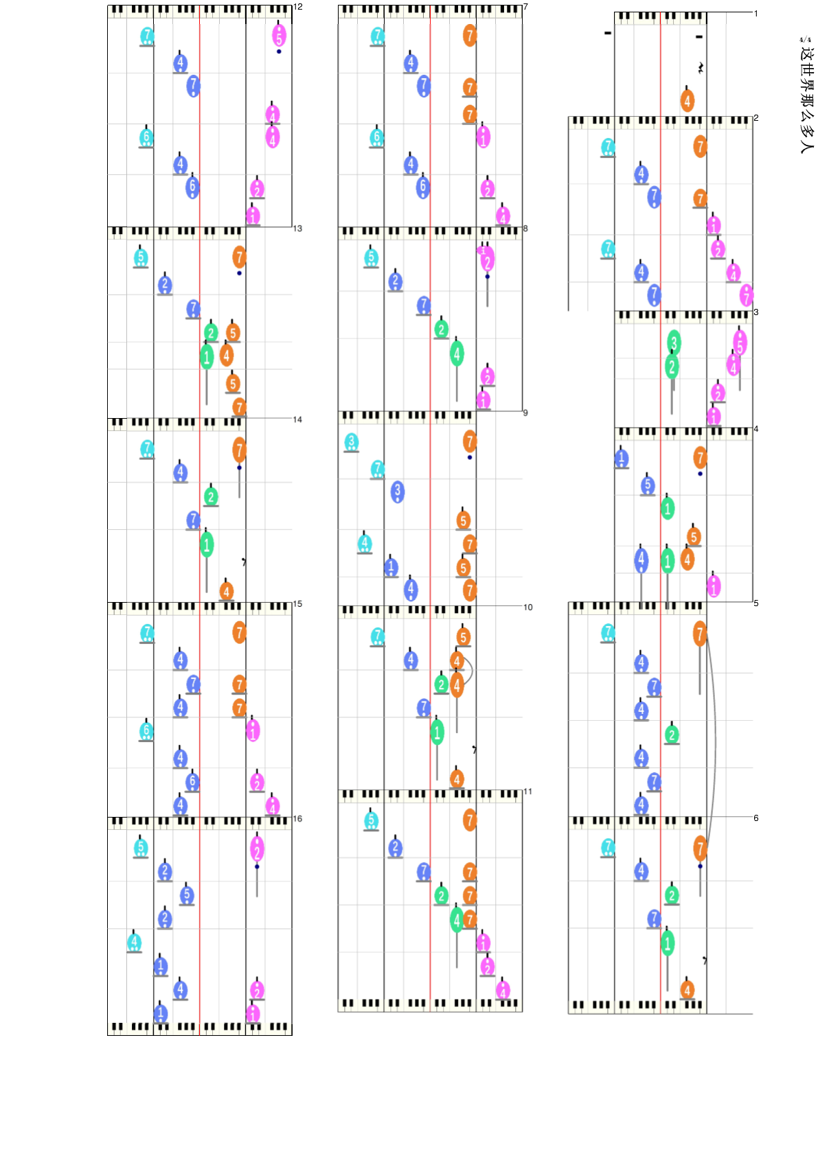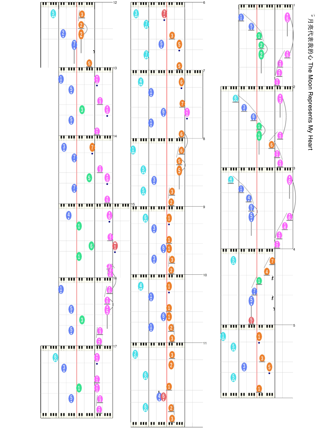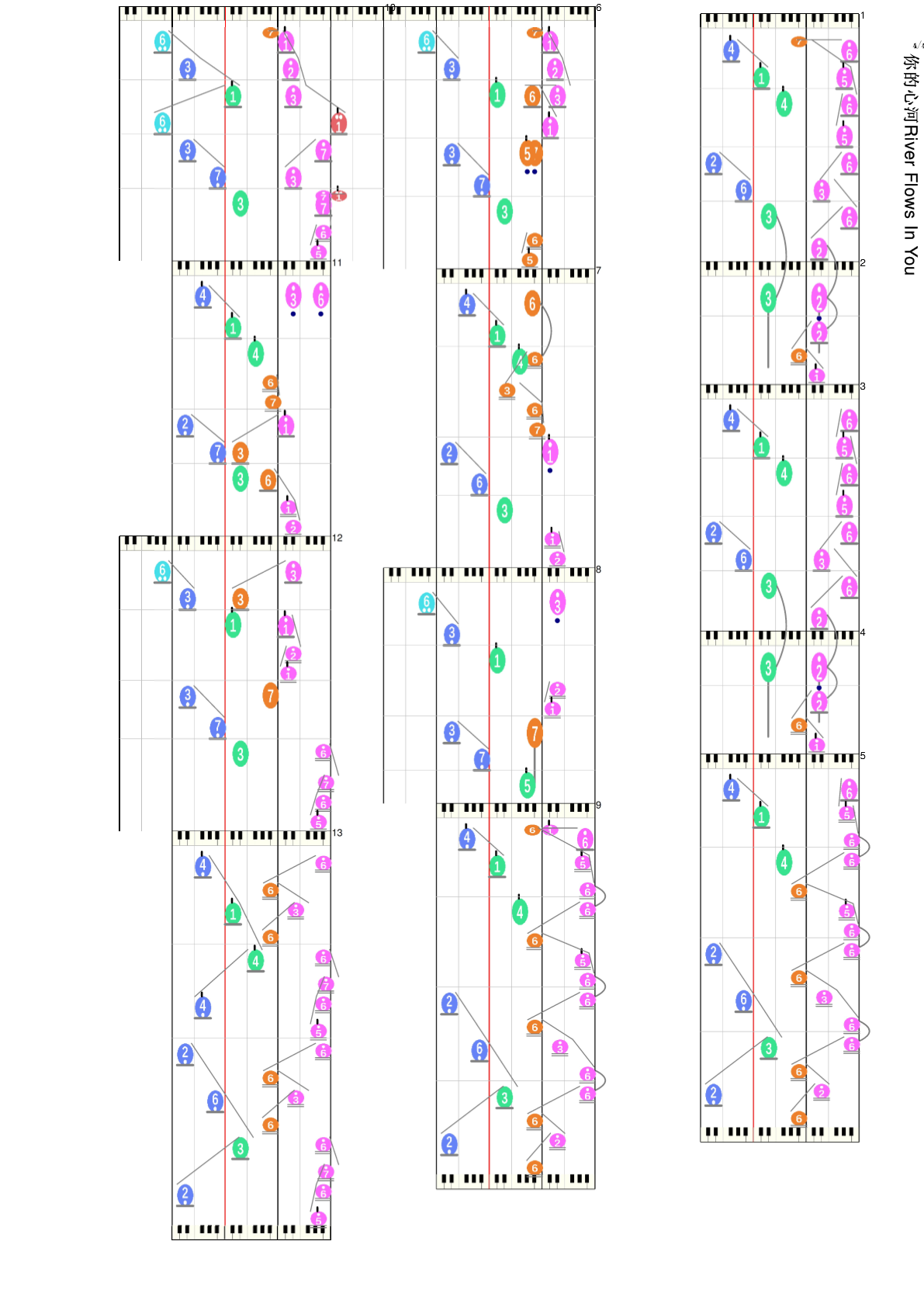 阅读顺序:从上到下,从右到左。 (先从右上角开始从上到下弹,弹完竖行,再第二竖行,有点像对联的阅读顺序) 规则: 每小节都画出钢琴键,方便定位音符位置。 红竖线旁边是中央C 左手弹蓝色调 右手弹红色调 分类:数字谱、 图标谱、 字母谱 1 数字谱 如果你熟悉简谱,就用数字谱。 数字谱适合和简谱基础的成年人。 2 图标谱,使用的是简谱的谐音 do -- 朵 (一朵花) re -- 蕊 (花蕊) mi -- 米 (米粒) fa -- 发 (头发) so -- 锁 (锁头) la -- 蜡 (蜡烛) xi -- 西 (西瓜) 图标谱的好处是打印缩小了也可以看清楚。 只要大致认出图标就好了。 3 字母谱是简谱的拼音首字母 do -- D re -- R mi -- M fa -- F so -- S la -- L xi -- X