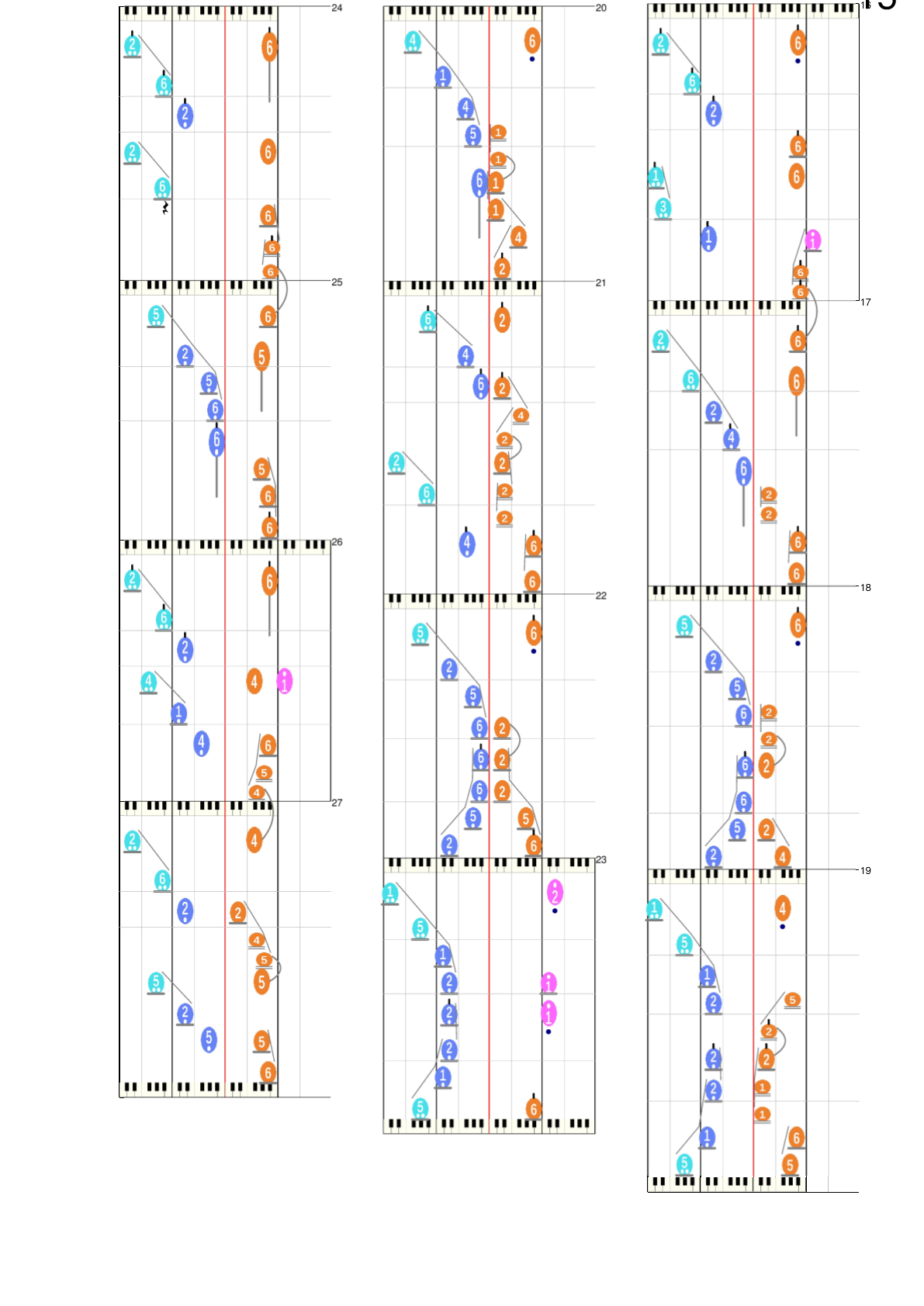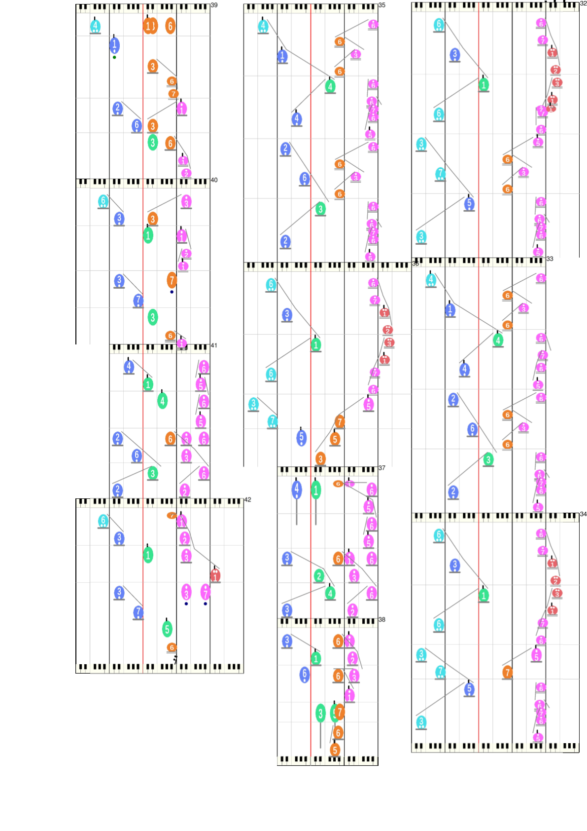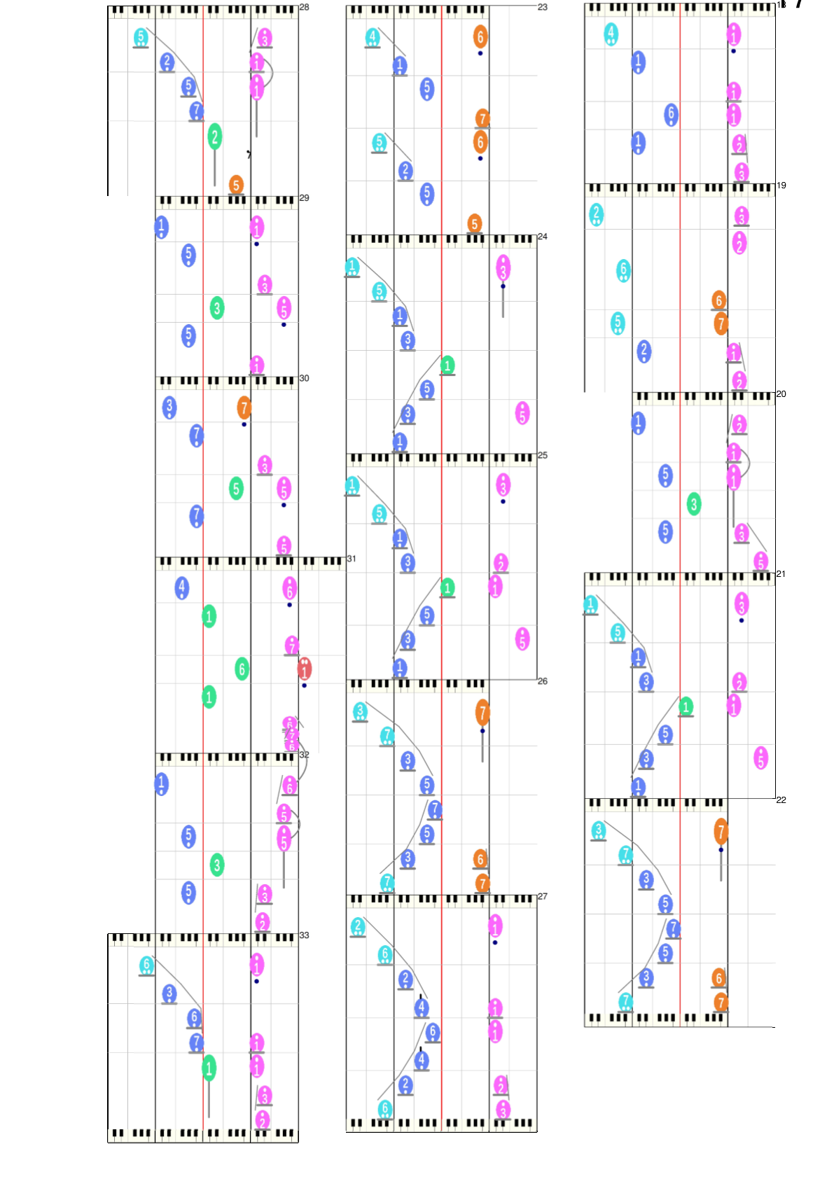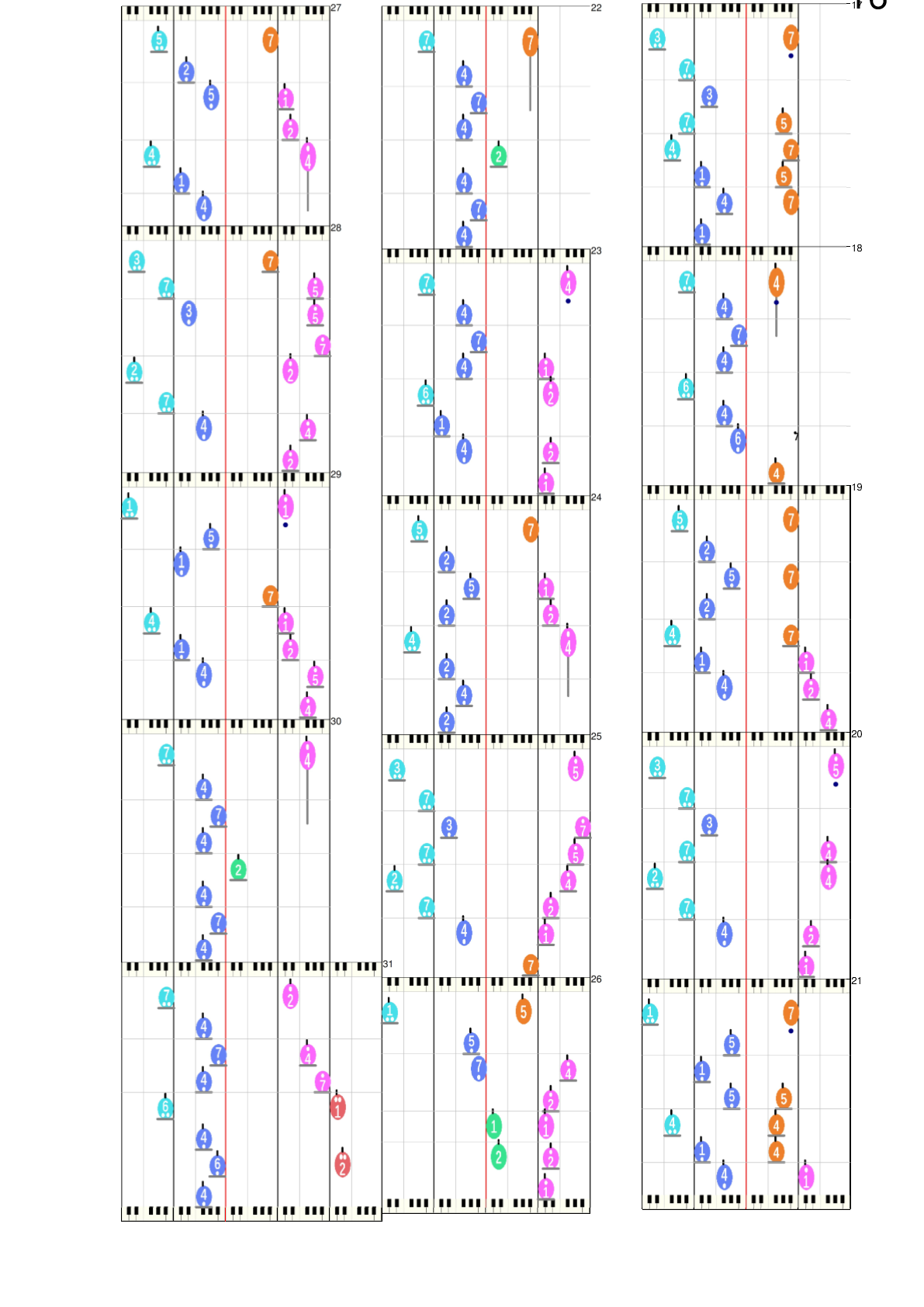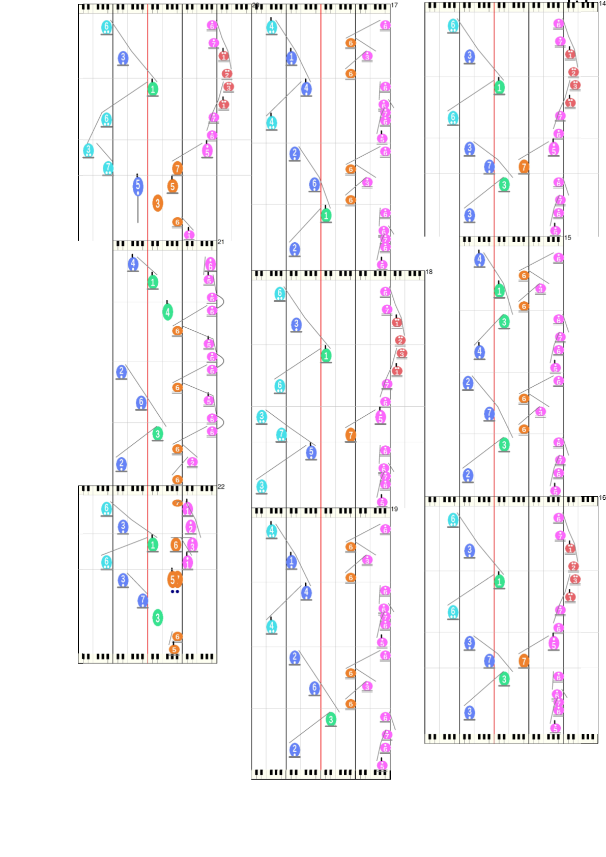 阅读顺序:从上到下,从右到左。 (先从右上角开始从上到下弹,弹完竖行,再第二竖行,有点像对联的阅读顺序) 规则: 每小节都画出钢琴键,方便定位音符位置。 红竖线旁边是中央C 左手弹蓝色调 右手弹红色调 分类:数字谱、 图标谱、 字母谱 1 数字谱 如果你熟悉简谱,就用数字谱。 数字谱适合和简谱基础的成年人。 2 图标谱,使用的是简谱的谐音 do -- 朵 (一朵花) re -- 蕊 (花蕊) mi -- 米 (米粒) fa -- 发 (头发) so -- 锁 (锁头) la -- 蜡 (蜡烛) xi -- 西 (西瓜) 图标谱的好处是打印缩小了也可以看清楚。 只要大致认出图标就好了。 3 字母谱是简谱的拼音首字母 do -- D re -- R mi -- M fa -- F so -- S la -- L xi -- X