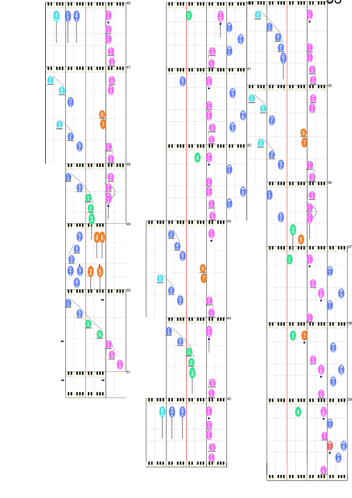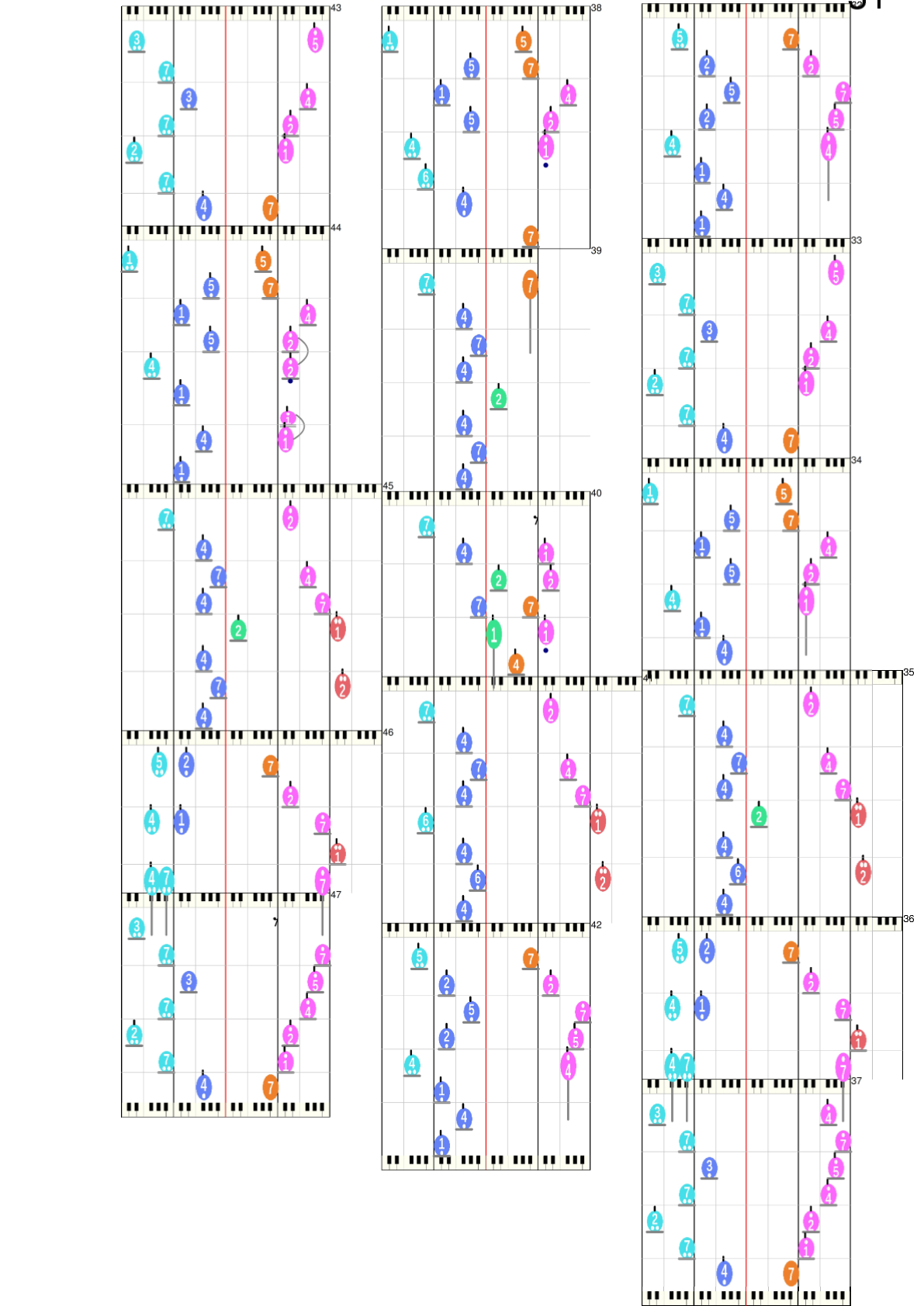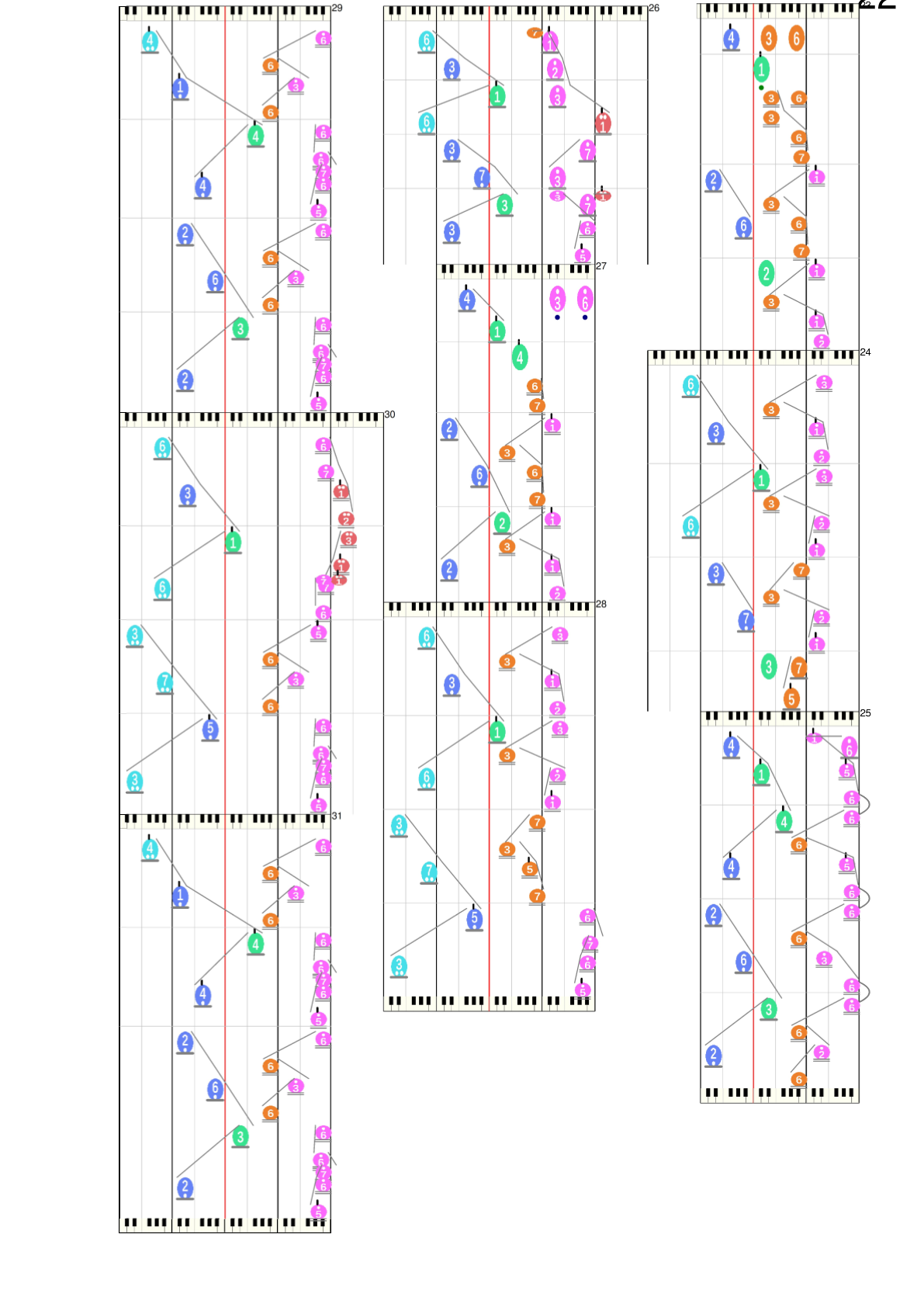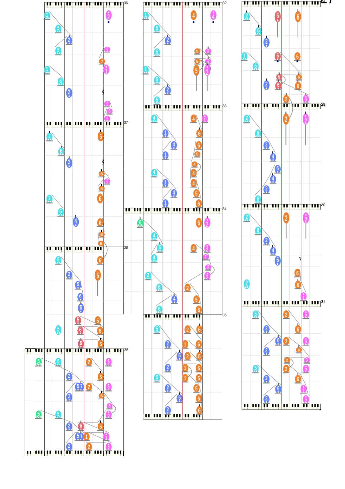 阅读顺序:从上到下,从右到左。 (先从右上角开始从上到下弹,弹完竖行,再第二竖行,有点像对联的阅读顺序) 规则: 每小节都画出钢琴键,方便定位音符位置。 红竖线旁边是中央C 左手弹蓝色调 右手弹红色调 分类:数字谱、 图标谱、 字母谱 1 数字谱 如果你熟悉简谱,就用数字谱。 数字谱适合和简谱基础的成年人。 2 图标谱,使用的是简谱的谐音 do -- 朵 (一朵花) re -- 蕊 (花蕊) mi -- 米 (米粒) fa -- 发 (头发) so -- 锁 (锁头) la -- 蜡 (蜡烛) xi -- 西 (西瓜) 图标谱的好处是打印缩小了也可以看清楚。 只要大致认出图标就好了。 3 字母谱是简谱的拼音首字母 do -- D re -- R mi -- M fa -- F so -- S la -- L xi -- X